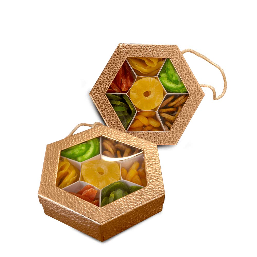 مجموعة متنوعة فاخرة من الفواكه المجففة . تقدم في علبة ذهبية بحجم (500غ) من محتوياتها: مشمش مجفف، تين مجفف، برقوق مجفف, أناناس مجفف ، منجو مجفف ، كيوي مجفف.