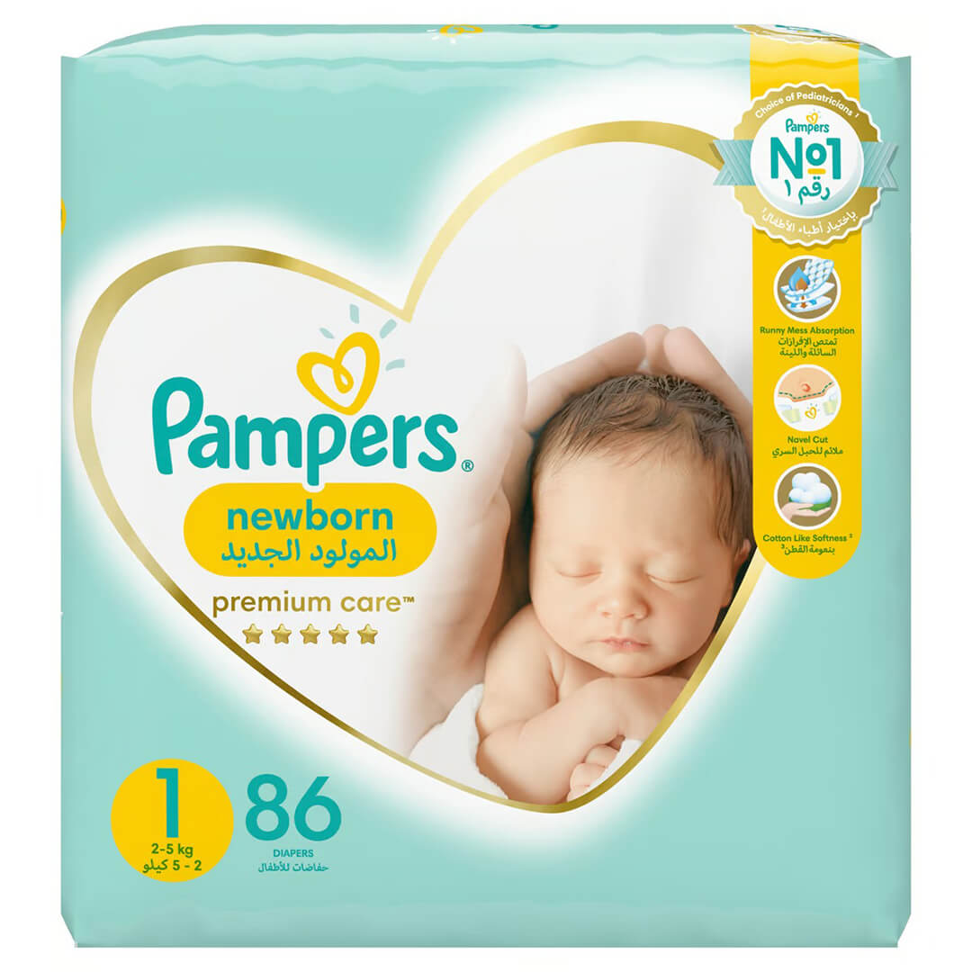 حفاضات بامبرز بريميوم كير الحفاضات الأنعم مقاس 1(2-5كلغ) 86pcs
