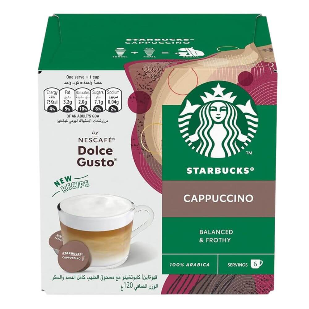 كبسولات ستاربكس كابتشينو من نسكافيه دولتشي غوستو كريميه وغنيه تذوق نكهة ورائحة مقهى ستاربكس اليوم من البيت بكل راحة من بقالة مارتو !