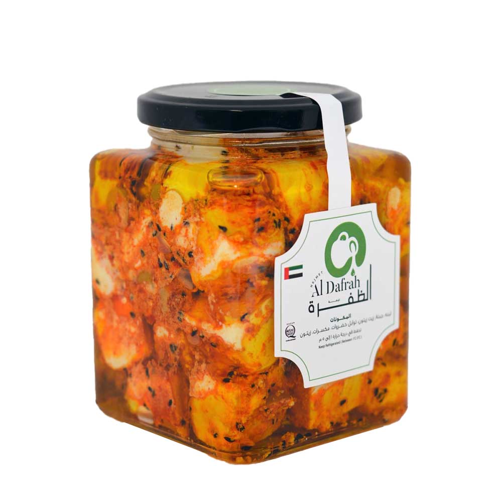 Explore the delightful blend of Al Dafrah Cheese Mix Makdous 250g with Olive Oil and Spices, exclusively at Martoo Online. Elevate your dishes with this gourmet cheese mix infused with the rich essence of Makdous, olive oil, and aromatic spices. Order now for a burst of culinary delight!