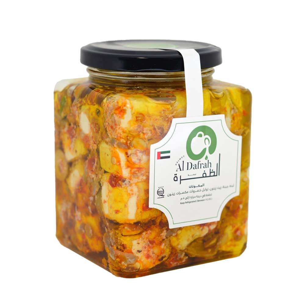 Introducing the irresistible and flavorful Al Dafrah Cheese Mix Pomegranate 250g. Blend of high-quality cheese cubes infused with aromatic spices and pomegranate, all submerged in premium quality olive oil. This unique blend of ingredients gives the cheese a tangy, fruity taste that will tantalize your taste buds. Made from the finest, freshest milk and carefully crafted to ensure a smooth and creamy texture. The addition of pomegranate and spices gives it a unique and delightful taste that will make it a hit at any gathering. Carefully prepared and sealed each 250g package of Al Dafrah Cheese Mix Pomegranate, to maintain its freshness and quality. It is a perfect accompaniment to any dish or can be served as a standalone appetizer. Experience the delicious taste and fruity flavor of Al Dafrah Cheese Mix Pomegranate 250g in olive oil, spices, and pomegranate, and take your culinary experience to the next level. It is a perfect addition to any cheese board or snack platter and is sure to impress your guests. Martoo Online Grocery Store - Quality Food Products at Unbeatable Prices!
